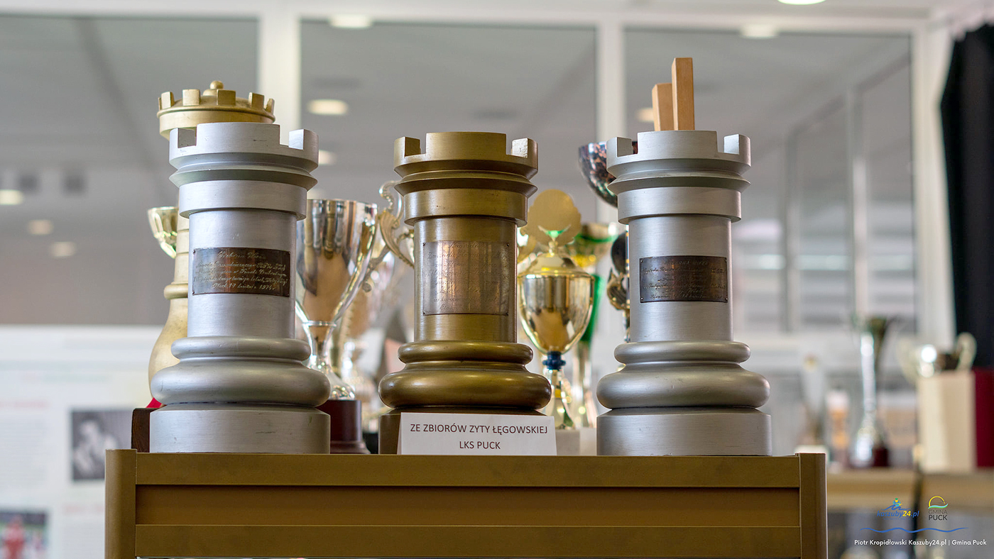 Właśnie na zamku w Uniejowie rozpoczął się Finał Centralny 63. Ogólnopolskiego Masowego Turnieju Szachowego LZS o „Złotą Wieżę” (12-17 lipca), którego ambasadorem jest arcymistrz Jan-Krzysztof Duda. My tymczasem wypatrzyliśmy na znakomitej wystawie „75-lecia LZS na Pomorzu”, którą można oglądać w Luzinie wspaniałe „zabytki” – to puchary w kształcie wież, które zdobyła na turniejach zawodniczka LKS Puck (wcześniej LZS POM Puck) Zyta Łęgowska i udostępniła na wystawę. Pani Zyta i jej klub po raz pierwszy wystartowali w finale centralnym „Złotej Wieży” w 1967 roku i potem prawie nieprzerwanie startowali do 1975 roku. Zyta Łęgowska należała wtedy do najlepszych zawodniczek klubu i turnieju. Wieże, które prezentowane są na zdjęciu to indywidualne zdobycze szachistki. W 1971 roku wprowadzono bowiem w finale centralnym turniej indywidualny, oddzielny dla kobiet i mężczyzn. Takie turnieje organizowano do 1983 roku. W tych indywidualnych szachowych potyczkach Zyta Łęgowska zdobyła 4 medale – złoty w 1972 roku, 3 srebrne – 1971, 1973 i 1974.
