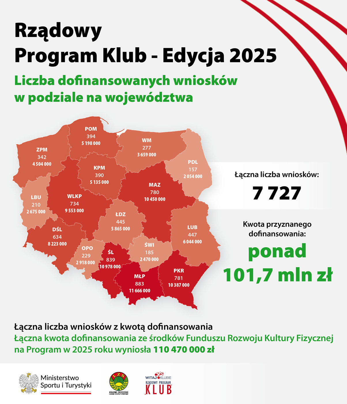 Zgodnie z Decyzją Ministra Sportu i Turystyki z dnia 30 kwietnia 2025r. dotacja ze środków Funduszu Rozwoju Kultury Fizycznej przeznaczona na realizację w 2025 roku Programu została zwiększona do kwoty 110 470 000 złotych, co pozwoliło objąć dofinansowaniem 7 727 klubów i stowarzyszeń, tj. o 921 klubów więcej, niż w 2024 roku.